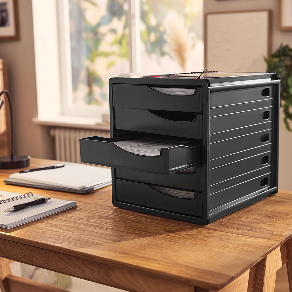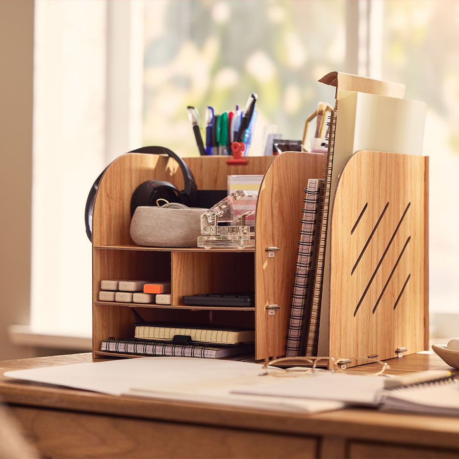 Schaff dir ein Ordnungssystem aus Aktenordnern, Rollcontainern und Schreibtisch-Organizern, in denen vom Stift bis zur wichtigen Rechnung alles griffbereit unterkommt. Darüber hinaus gilt: