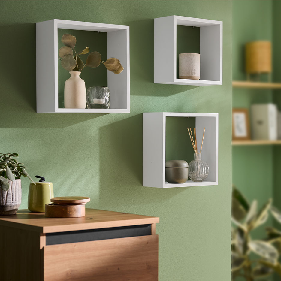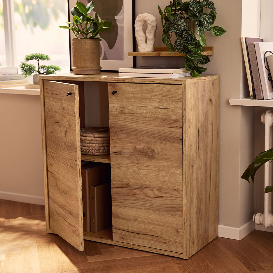 Lowboards oder Kommoden mit geschlossenen Fronten schaffen einen ruhigen Eindruck – egal, ob hinter den Türen Unordnung herrscht. Liebst du offene Regale, verschwindet Krimskrams einfach in hübschen Aufbewahrungsboxen und -körben im Textil-Look.