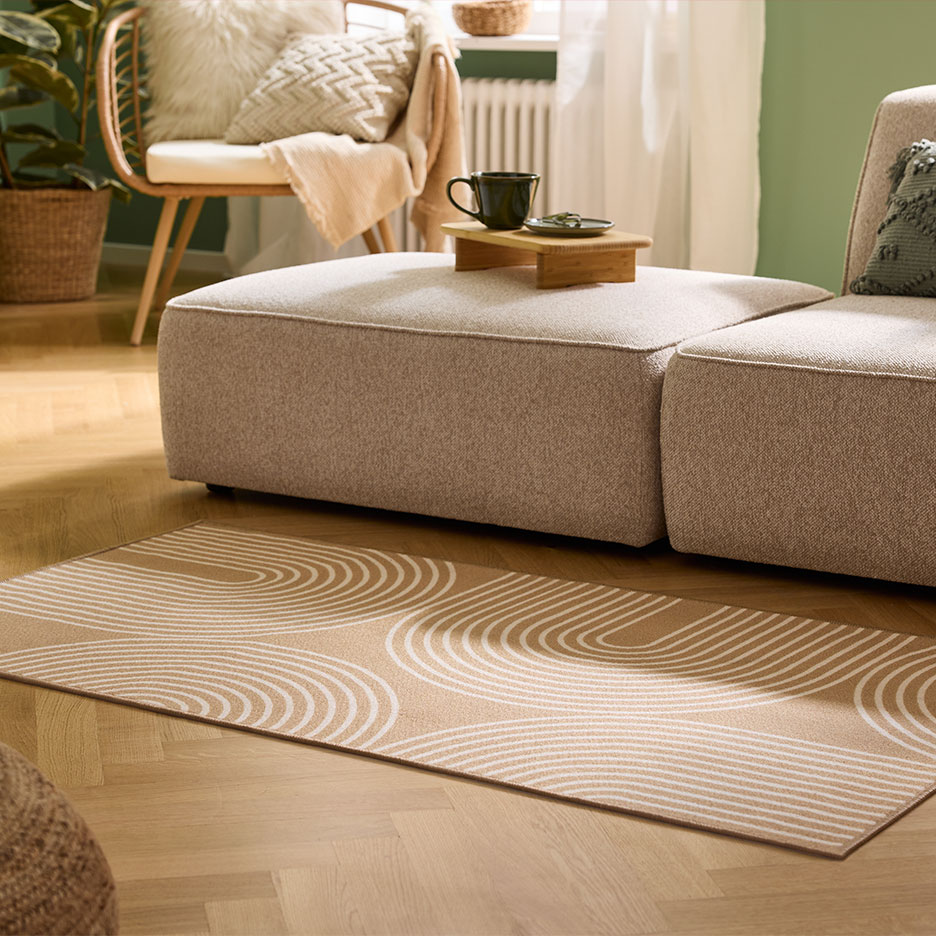 Auch durch die Raumgestaltung kannst du einen aufgeräumten Look schaffen. Ein Teppich in der Sitzecke schafft eine Ruheinsel und triggert den Ordnungssinn: Wir wollen die flauschige Fläche in vollen Zügen genießen und die schöne Optik perfekt in Szene setzen. Also räumen wir Dinge, die nicht dort hingehören, fast automatisch weg.